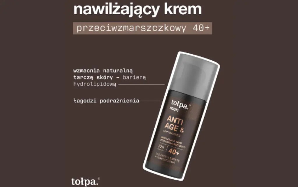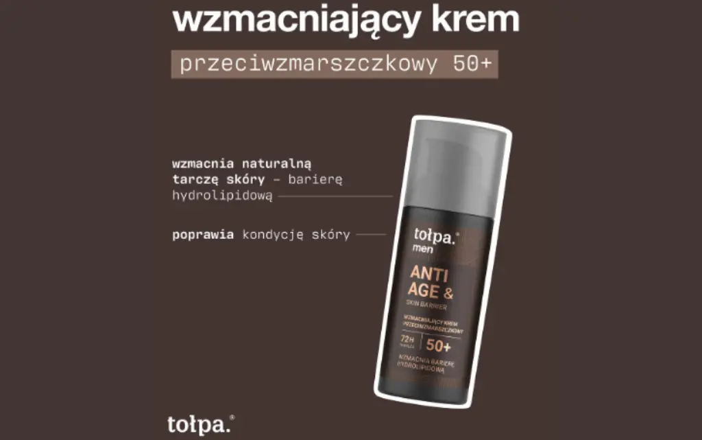 Wzmacniający krem przeciwzmarszczkowy 50+ z linii Tołpa Men Anti-age & skin barrier silnie nawilża do 72 godzin, spłyca zmarszczki (po czterech tygodniach stosowania), wzmacnia barierę hydrolipidową skóry oraz zwiększa jej jędrność. Torf tołpa®, zawarty we wszystkich kosmetykach marki, jest skarbnicą substancji czynnych, takich jak fulwokwasy, bituminy, aminokwasy, oraz makro- i mikroelementy, dzięki czemu regeneruje skórę i zwalcza wolne rodniki. Podobnie jak nawilżający krem z tej samej linii, zawiera także karnozynę – dipeptyd, który opóźnia oznaki starzenia, silnie nawilżającą pochodną mocznika, zmiękczający olej migdałowy i łagodzący ekstrakt z buraka, a ponadto także lipoaminokwas, który ma za zadanie wypełniać zmarszczki.
