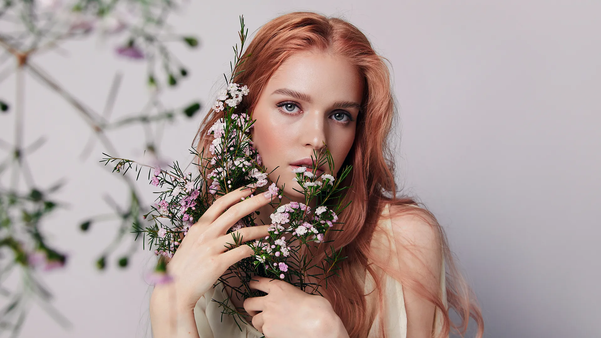 Kobieta z rudymi włosami i zielonymi oczami trzyma wiosenny bukiet kwiatów