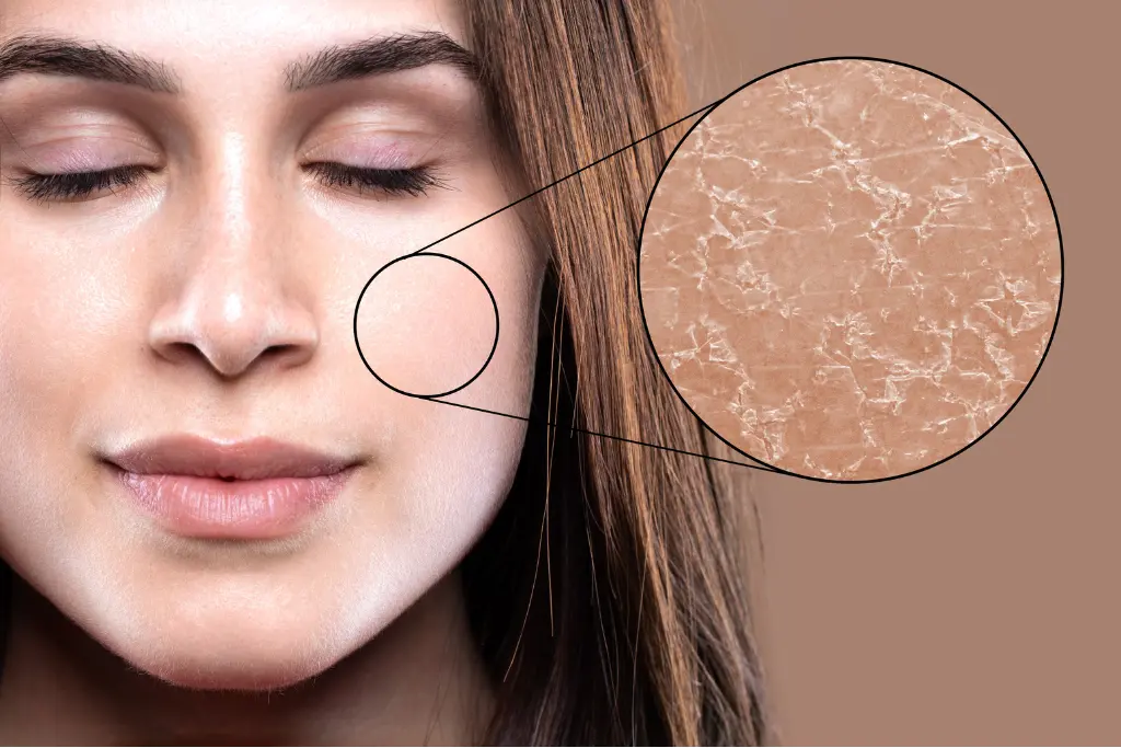 Odwodniona skóra jest napięta, matowa, z widocznymi drobnymi zmarszczkami i szorstka w dotyku.