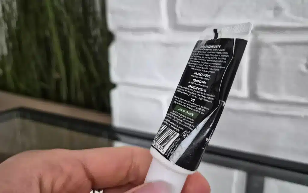 Kosmetyk zamknięty jest w minimalistycznej, białej tubce. Pierwsze wrażenie po aplikacji to poczucie konkretnego, „aptecznego” działania. Produkt nie jest typowym, wodnistym żelem – ma postać treściwego, białego kremu, który trzyma się miejsca aplikacji.